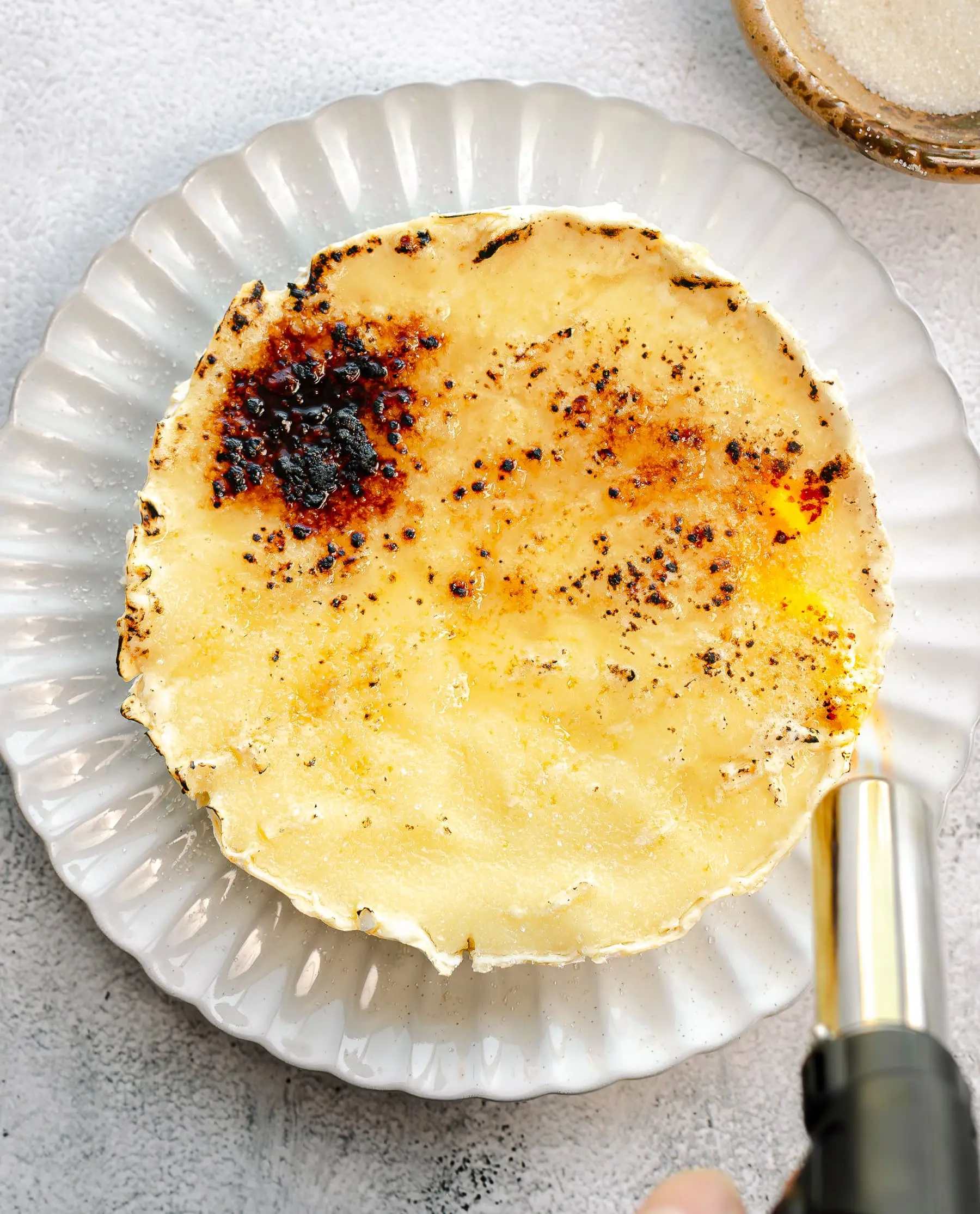 4. Sprinkle the granulated sugar evenly on top of the Brie. Using a kitchen torch, melt and brûlée the sugar until it’s deep golden brown and caramelized.