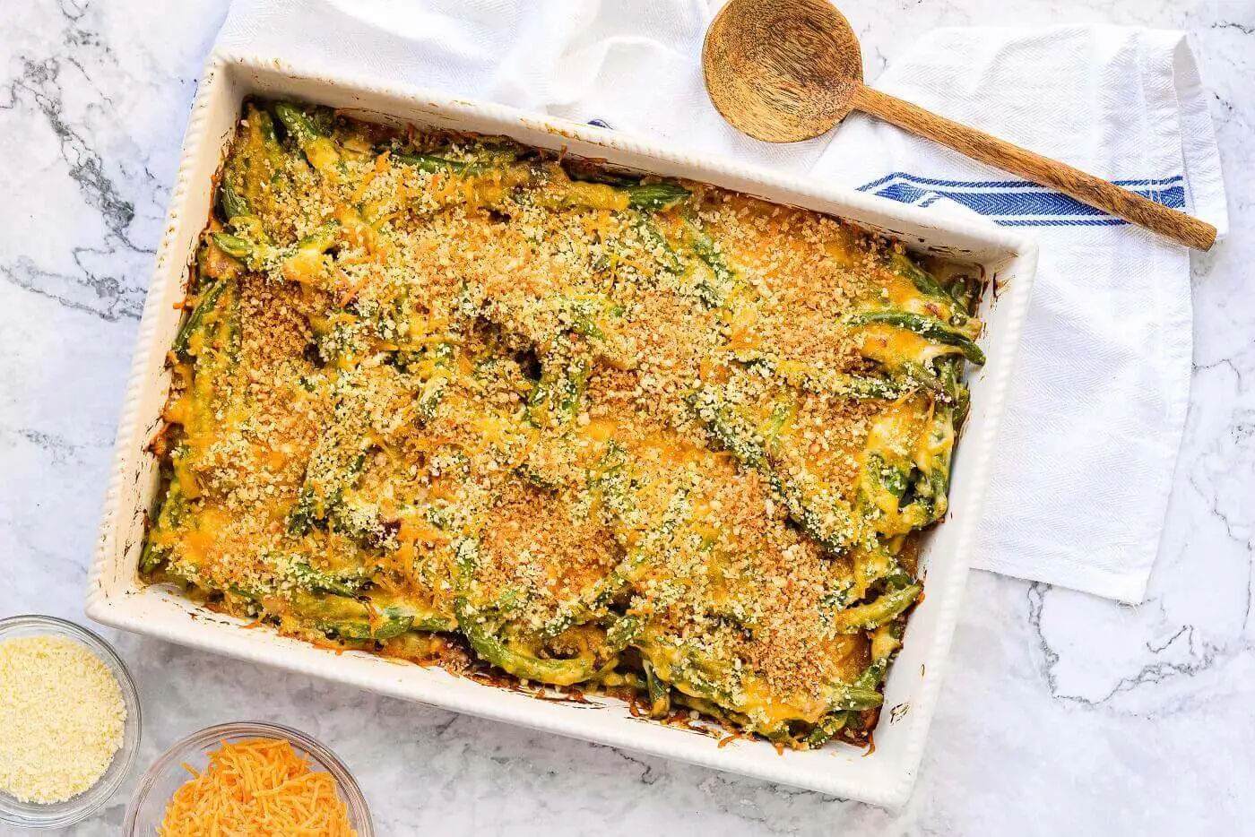 - In a large bowl combine the bacon mixture with the green beans, tossing to coat. Spread evenly in the prepared baking pan.* Top with the remaining shredded cheddar cheese and the panko breadcrumb mixture. Bake for 30 minutes, or until golden brown.