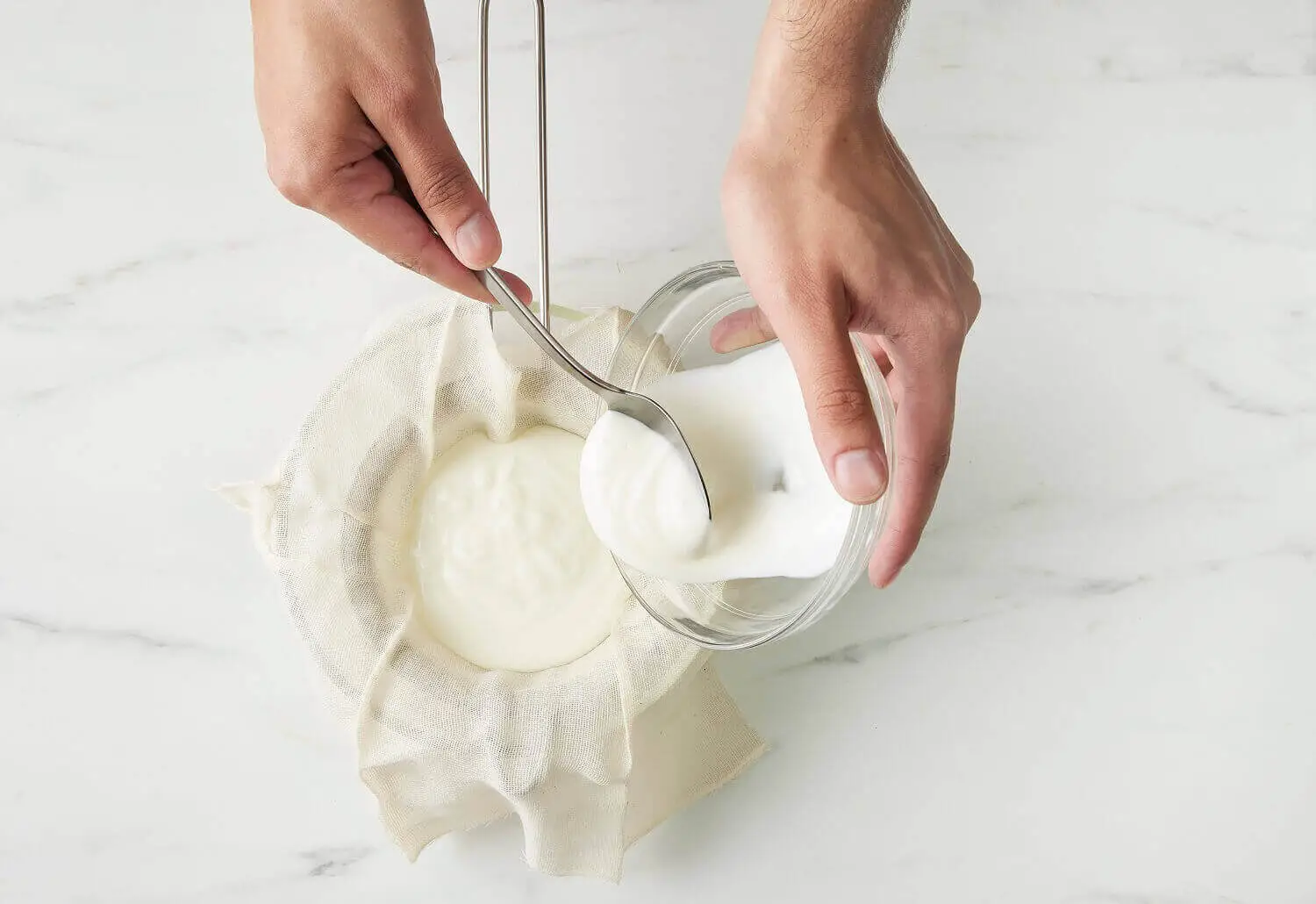 - Spoon the yogurt into the strainer with cheesecloth and wrap the sides of the cheesecloth over the yogurt to protect it.