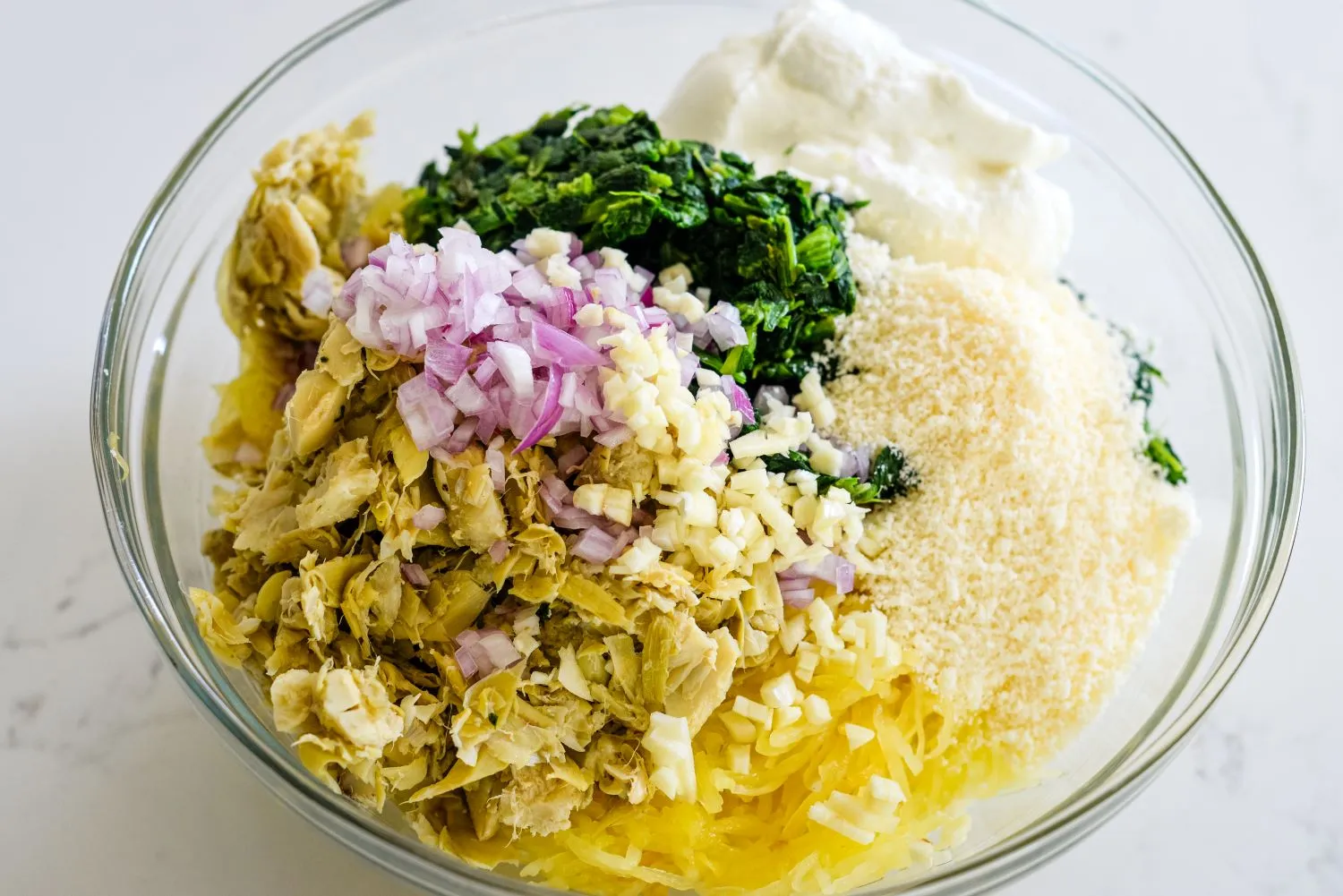 - Add artichoke hearts, spinach, shallot, garlic, cream cheese, yogurt, Parmesan cheese, salt and pepper to squash strands.