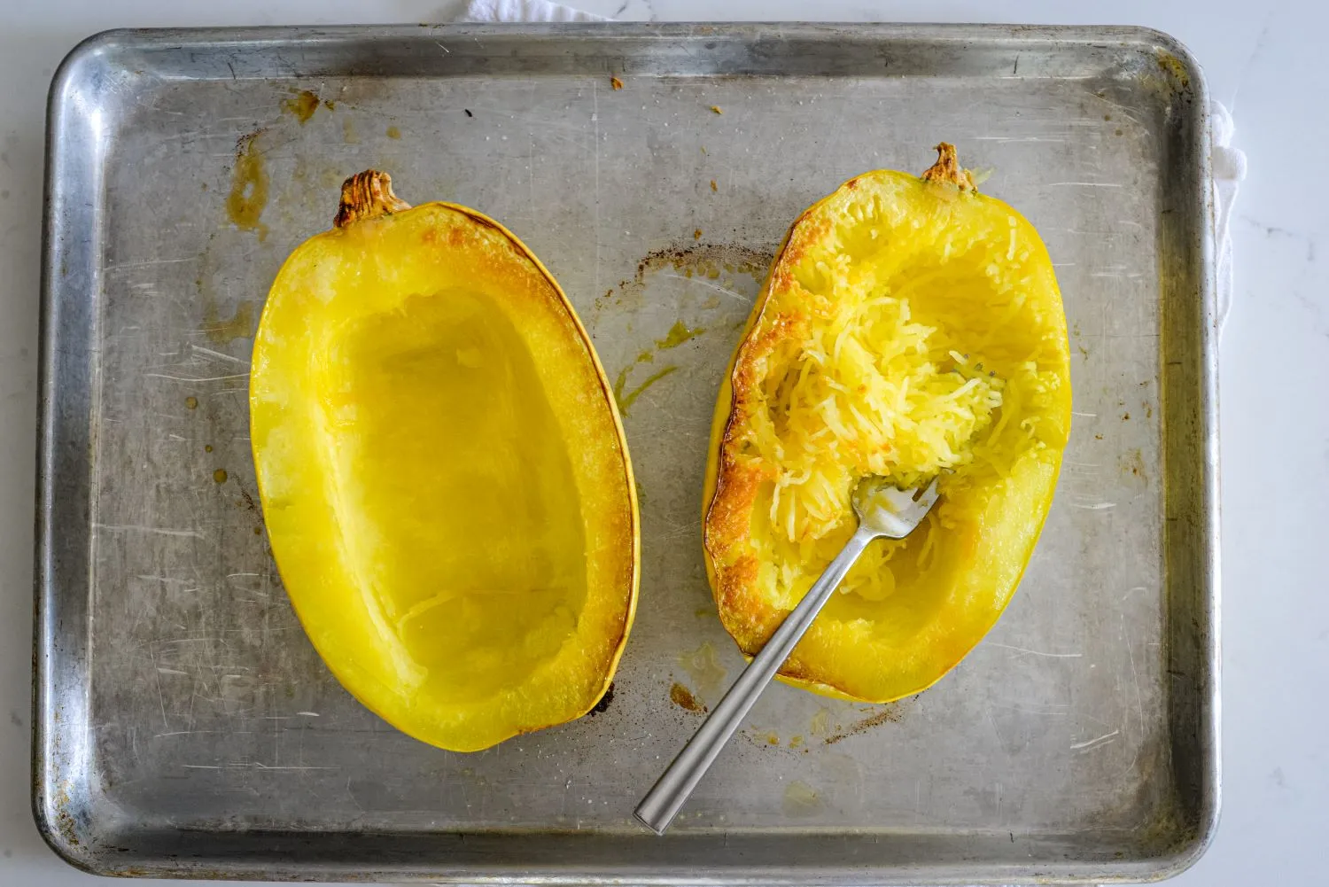 - Using a fork, pull the strands of squash crosswise from the peel so they resemble spaghetti. Do not pierce squash skin. Transfer squash strands to a large bowl. Reserve the squash skins on the baking sheet. Increase oven temperature to 425 F.